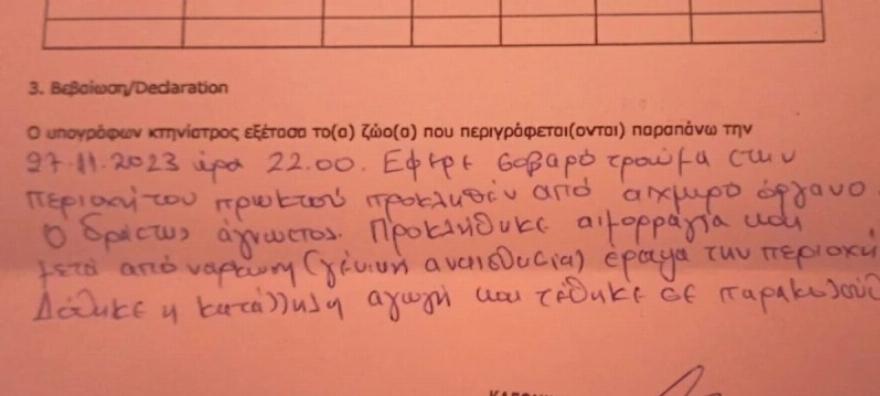 27.11.2023 ώρα 22.00. Έφερε σοβαρό τραύμα στην περιοχή του πρωκτού, προκληθέν από αιχμηρό όργανο.