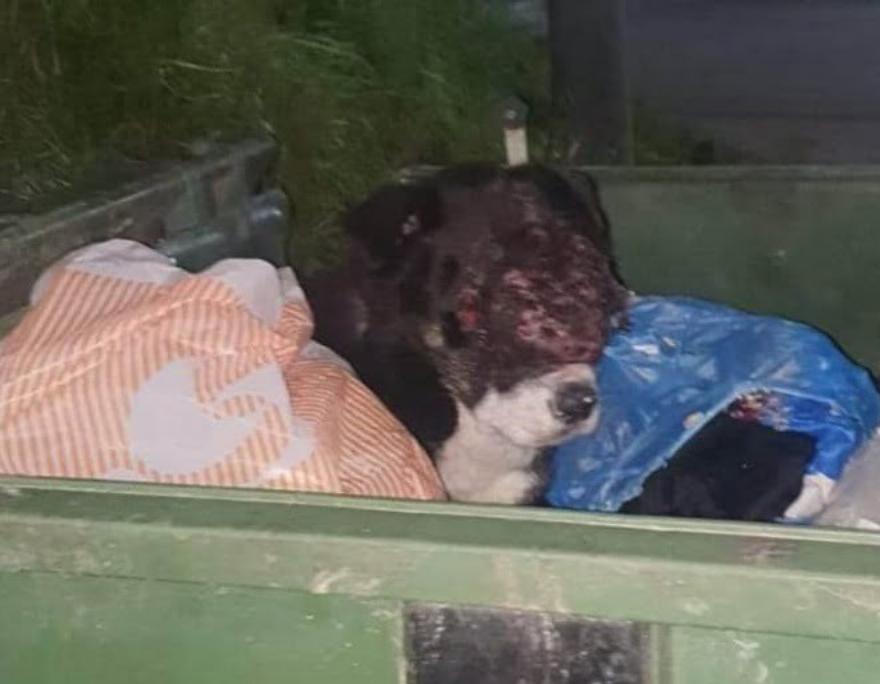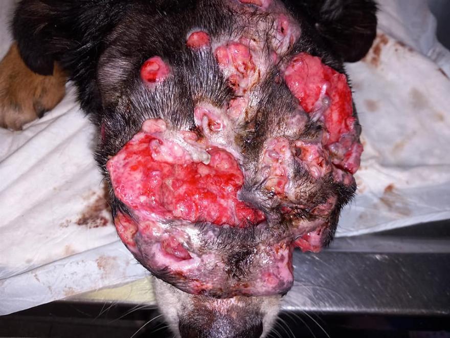 Το πλάσμα, που ήταν μια άμορφη μάζα με όγκο στο κεφάλι, μεταμορφώθηκε σε κανονικό σκύλο μέσα σε δύο μήνες. Φαίνεται ότι το ζώο πετάχτηκε σε κάδο απορριμμάτων για να το πετάξει κάποιος αντί να ζητήσει βοήθεια.
