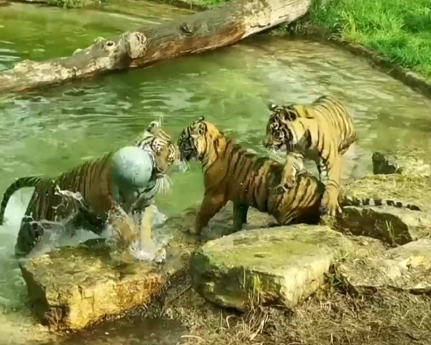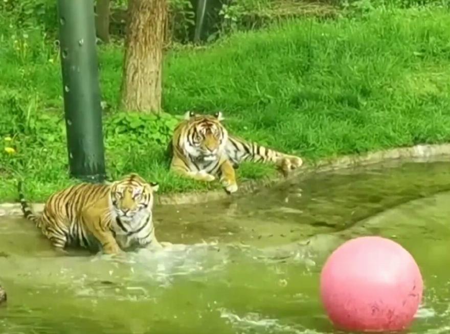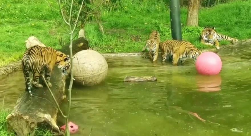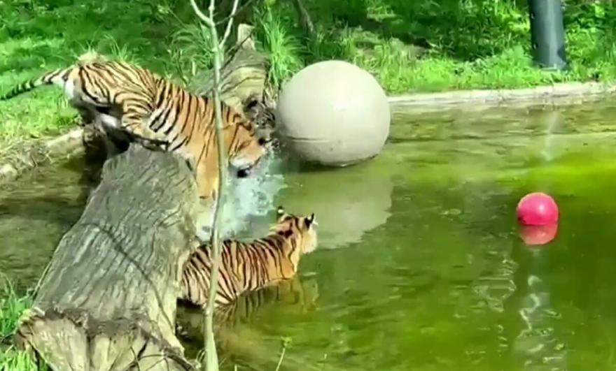 Όπως φαίνεται στο βίντεο, οι νεαρές τίγρεις εμφανίζονται αρχικά διστακτικές. Βέβαια, οι φύλακες του ζωολογικού κήπου έβαλαν πλαστικές μπάλες στη λίμνη.