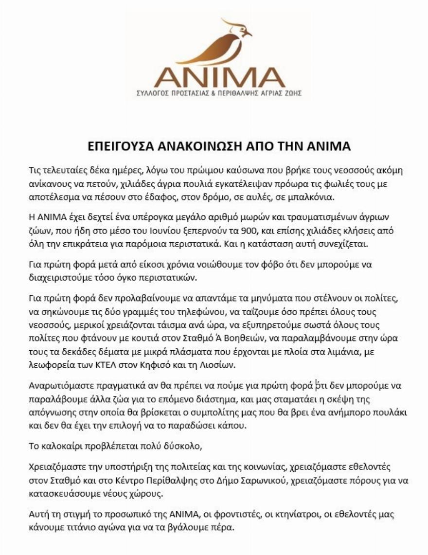 Αυτή τη στιγμή, το προσωπικό της ΑΝΙΜΑ, οι φροντιστές, οι κτηνίατροι και οι εθελοντές μας δίνουν έναν τιτάνιο αγώνα για να ανταπεξέλθουν. Σας καλούν να μας βοηθήσετε σε αυτή τη δύσκολη περίοδο.