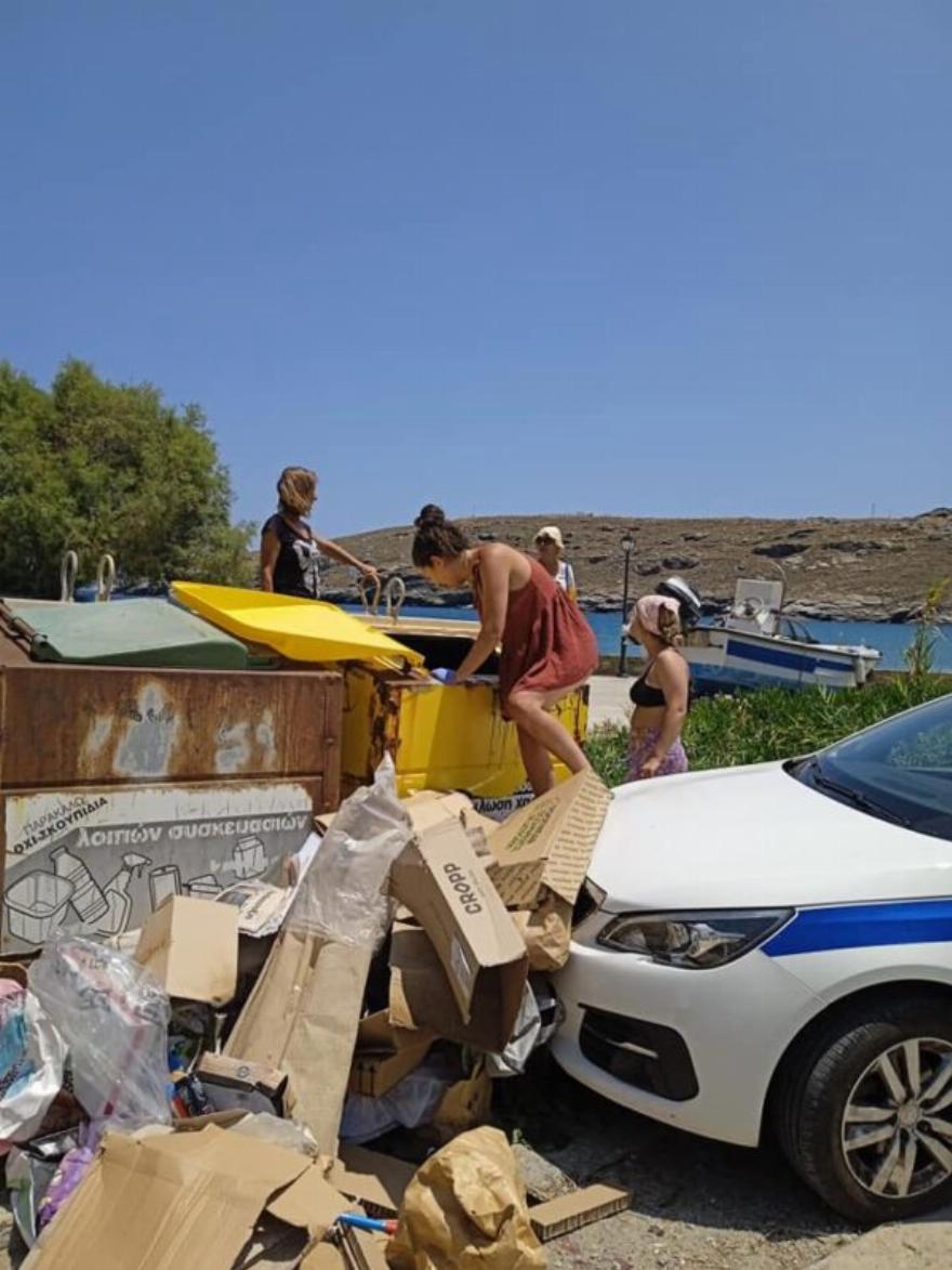Δύο εθελόντριες του Φιλοζωικού Σωματείου Άνδρου βρέθηκαν στο Παραπόρτι, όπου προς μεγάλη τους έκπληξη, αντίκρισαν έναν αστυνομικό μέσα στον κάδο και τις κοπέλες να τον βοηθούν να βγάλει έξω τα χαρτόκουτα και τα απορρίμματα. Είχαν ήδη καταφέρει να βγάλουν από τον κάδο τέσσερα νεογέννητα γατάκια και έψαχναν ένα ακόμη που ακουγόταν να κλαίει.