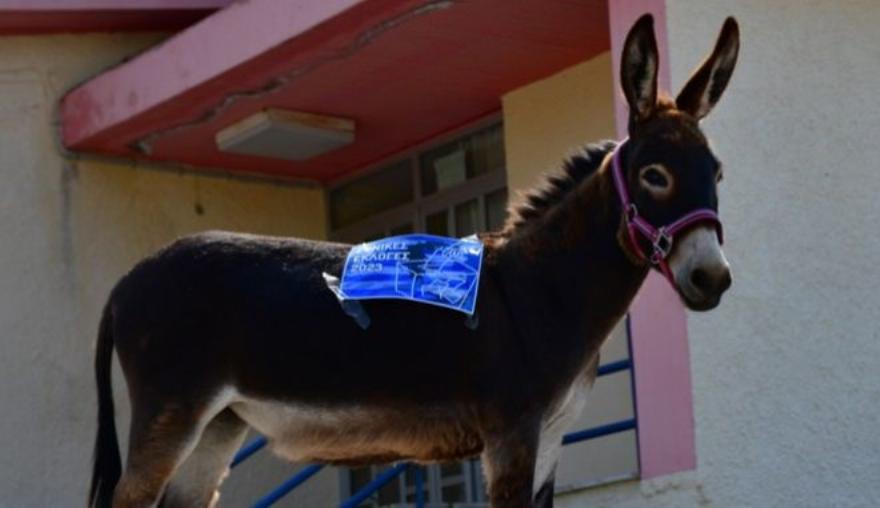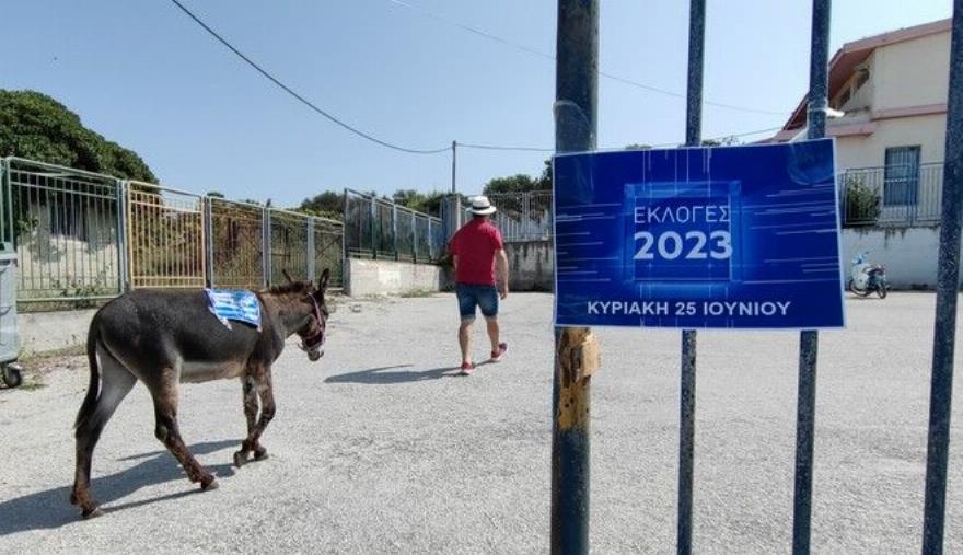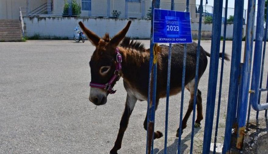 Ένας αγρότης προσήλθε στο εκλογικό τμήμα με τον πιστό σύντροφό του, έναν γάιδαρο που φόρτωσε με τον πιο αυθόρμητο και αυθεντικό τρόπο το δικό του μήνυμα για τις εκλογές. Μάλιστα ο γάιδαρος είχε πάνω του και την ελληνική σημαία και μας κάνει να αναρωτιόμαστε τι θέλει να πει ο ποιητής… αγρότης;