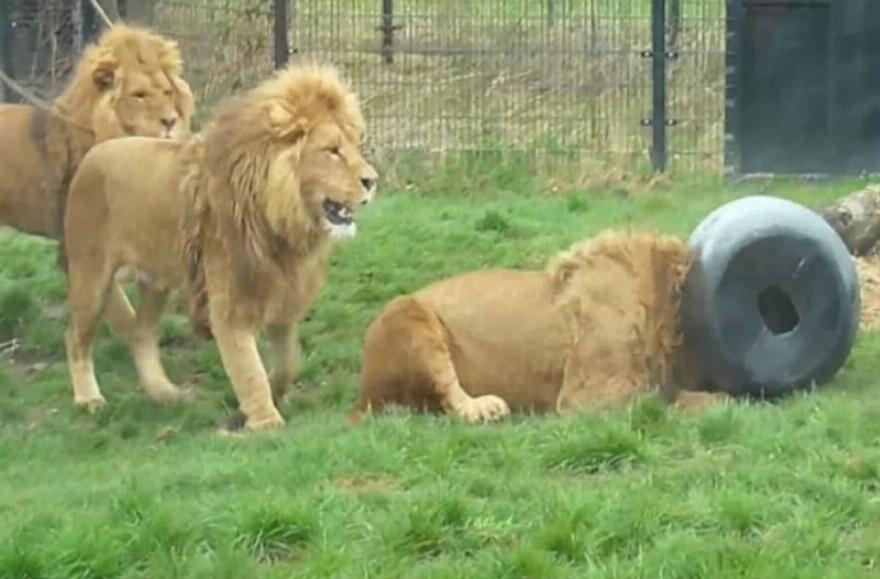 Ένα από τα λιοντάρια έχωσε το κεφάλι του σε ένα βαρέλι προσπαθώντας να πάρει κρέας και κόλλησε. Το κεφάλι του λιονταριού έχει κολλήσει στο βαρέλι και τρέχει πάνω κάτω πανικόβλητο προσπαθώντας να απελευθερώσει το κεφάλι, ενώ δύο εξίσου μεγάλα αδέρφια του προσπαθούν απεγνωσμένα να βοηθήσουν.