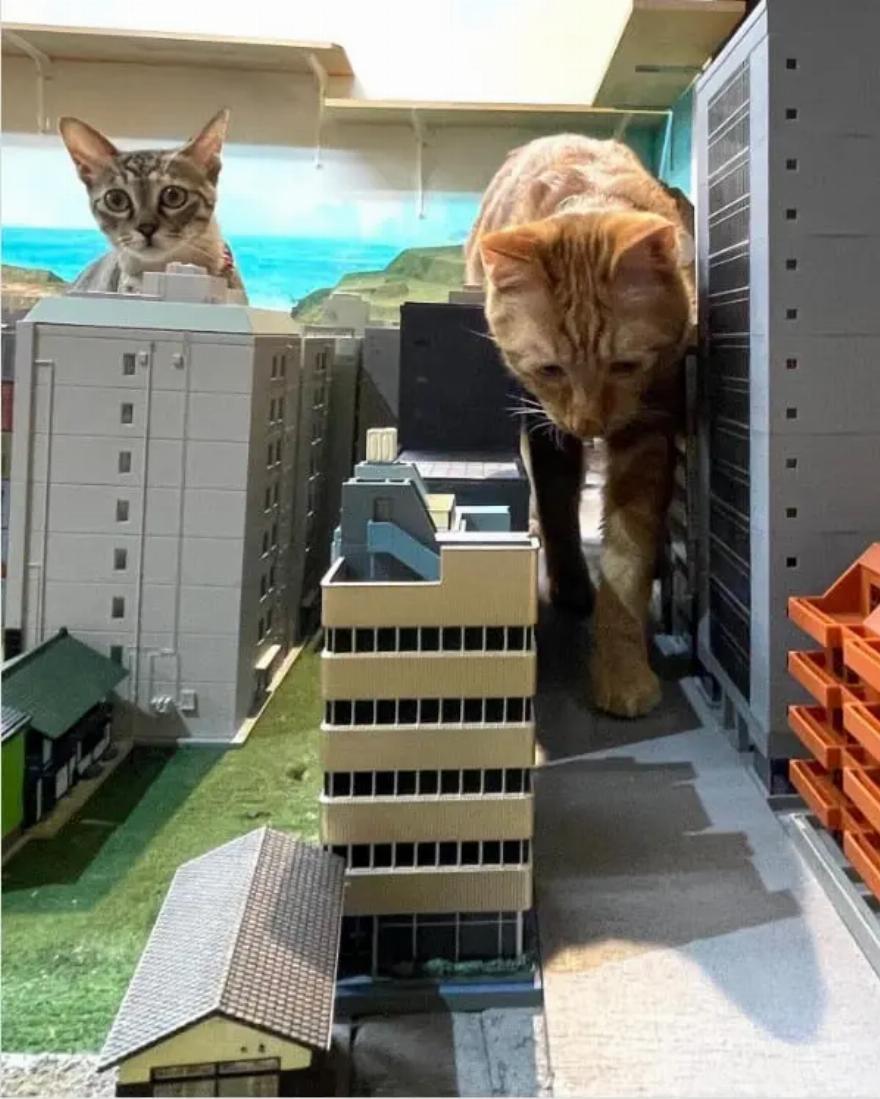 Στην ποπ κουλτούρα, η Ιαπωνία είναι γνωστή για γιγάντια πλάσματα όπως ο Γκοτζίλα και η Μόθρα. Μια επίσκεψη στο εστιατόριο Diorama στην Οσάκα είναι ένας πολύ καλός τρόπος για να δείτε τις γιγάντιες γάτες. Το εστιατόριο, το οποίο είναι επίσης καταφύγιο γατών, διαθέτει μοντέλα τοπίων και μικρών πόλεων που μοιάζουν να είναι γεμάτα με γάτες.