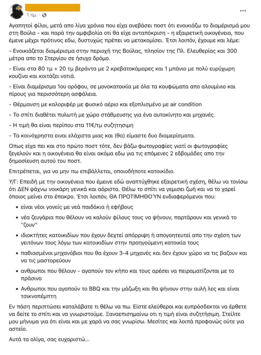 Ένας ιδιοκτήτης σπιτιού στη Βούλα αναζητά νοικάρηδες που να αποτελούν “τη ζωή του σπιτιού” και αυτή η αγγελία έχει προκαλέσει θετικές αντιδράσεις στα κοινωνικά μέσα. Το διαμέρισμα που προσφέρεται βρίσκεται στον 1ο όροφο ενός μονοκατοικίας, περιλαμβάνοντας 80 τετραγωνικά μέτρα και 20 τετραγωνικά μέτρα βεράντας, με δύο υπνοδωμάτια και ένα μπάνιο. Η κουζίνα είναι ευρύχωρη και βλέπει προς τη νότια κατεύθυνση, βρίσκεται κοντά στην πλατεία Ελευθερίας της Βούλας και “επιτρέπεται, αν όχι απαιτείται, οποιοδήποτε κατοικίδιο”.