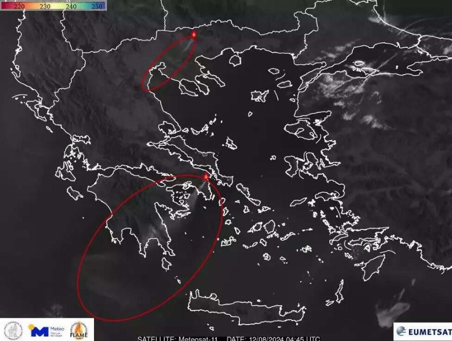 Στην δορυφορική εικόνα είναι επίσης εμφανής και η διασπορά του καπνού από τη δασική πυρκαγιά στο Μενοίκιον Όρος του νομού Σερρών.
