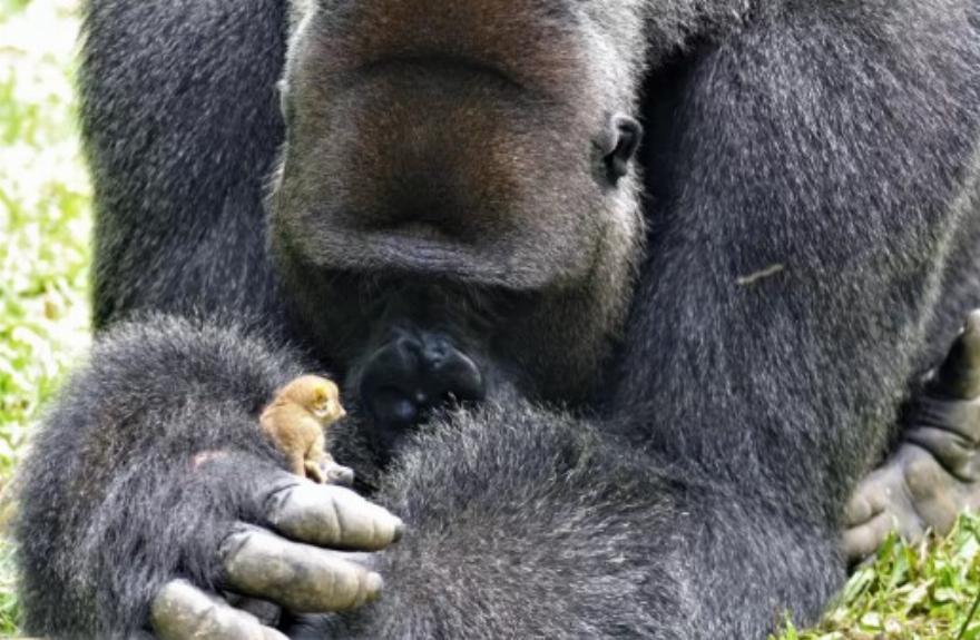 Αλλά παρόλο που ο Μπόμπο είναι το κυρίαρχο αρσενικό της ομάδας του, είναι γνωστό ότι είναι ένας ευγενικός γίγαντας. Και η ευγένεια του Μπόμπο δεν ήταν ποτέ πιο εμφανής όταν ο φροντιστής βρήκε τον Μπόμπο να κρατάει αγκαλιά ένα μικροσκοπικό μωρό άγριου θάμνου που είχε ανακαλύψει στο δάσος.