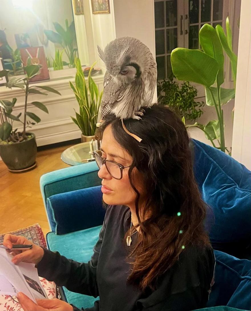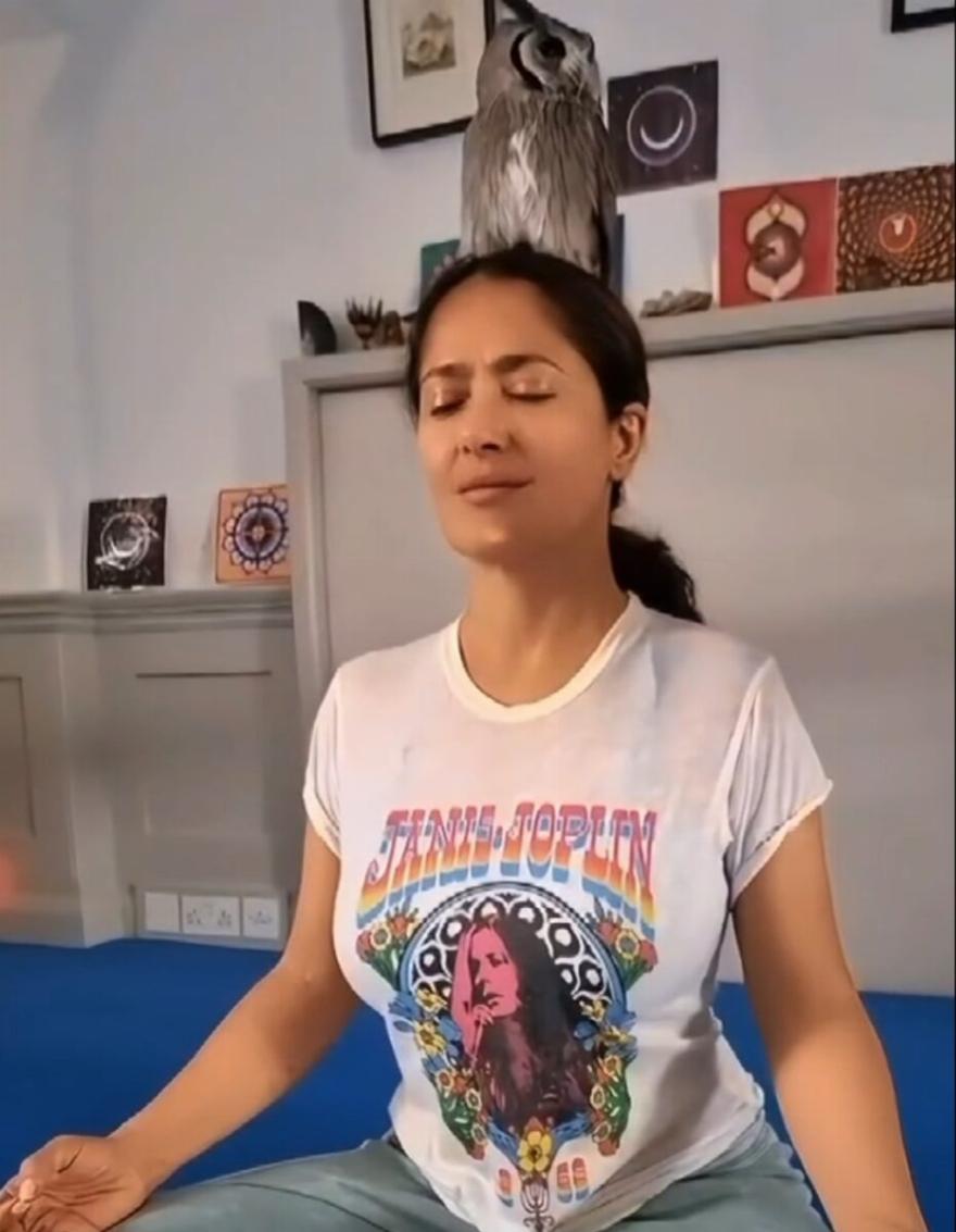 Η Σάλμα Χάγιεκ έχει μια ιδιαίτερη σχέση με την αγαπημένη της κουκουβάγια-κατοικίδιο, κάνοντας μαζί της ακόμα και διαλογισμό. Σε ένα βίντεο που δημοσίευσε στο Instagram την Κυριακή, η ηθοποιός φαίνεται καθισμένη στο πάτωμα ενός δωματίου με την κουκουβάγια να κάθεται στο κεφάλι της. Φορώντας απλά ρούχα, η Σάλμα προσέθεσε γραφικά ουράνιου τόξου γύρω από το σώμα της και απολάμβανε χαλαρωτική μουσική στο βάθος. Στη λεζάντα, ανέφερε: “Λατρεύω να διαλογίζομαι με την κουκουβάγια στο κεφάλι μου”. Η Χάγιεκ έχει αποκαλύψει πως έχει στενό δεσμό με την κουκουβάγια και κοιμουνται ακόμα μαζί, ενώ η κουκουβάγια απολαμβάνει ακόμα και το καλό κρασί.