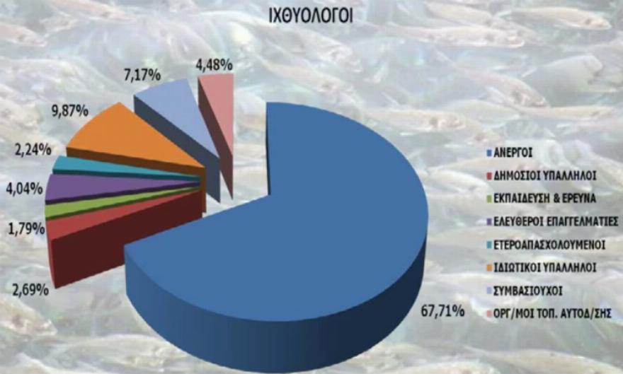 Για τους ιχθυολόγους των ΑΕΙ αξίζει να τονίσουμε ότι μικρός αριθμός εργάζεται στον ιδιωτικό τομέα. Σύμφωνα με τα στοιχεία του 2010 μόλις 62 σε σύνολο 823 εργάζονταν ως ιδιωτικοί υπάλληλοι ενώ στα στοιχεία του 2012 από τους 169 ιχθυολόγους (με άδεια ασκήσεως σε ισχύ) οι 32 απασχολούνταν ως υπάλληλοι στον ιδιωτικό τομέα. Οι περισσότεροι απασχολούνται στο δημόσιο τομέα ως μόνιμοι ή συμβασιούχοι. Βέβαια ο περιορισμός των προσλήψεων στο δημόσιο θα δώσει ένα ισχυρό πλήγμα στους ιχθυολόγους των ΑΕΙ.