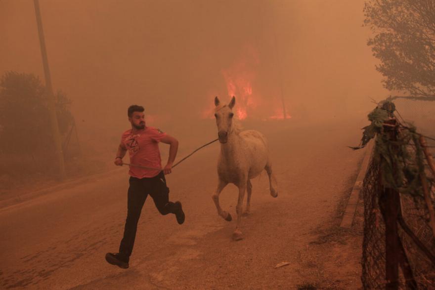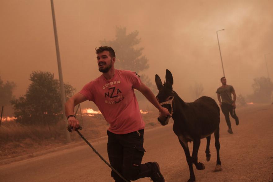 Συγκλονιστική είναι η προσπάθεια ενός κατοίκου της περιοχής της Φυλής να σώσει ζώα από τις φλόγες.