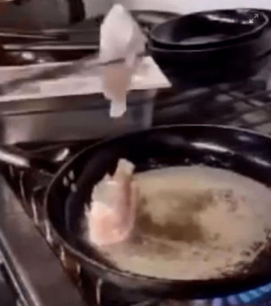 Και όσο τα ψάρια στην κυριολεξία σπαρταράνε, ο άντρας παίρνει με μία λαβίδα ένα από αυτά και το βάζει ζωντανό μέσα στο καυτό λάδι του τηγανιού. Το ψάρι είναι εν ζωή και τινάζεται μέσα στο τηγάνι μέχρι που ξεψυχάει.
