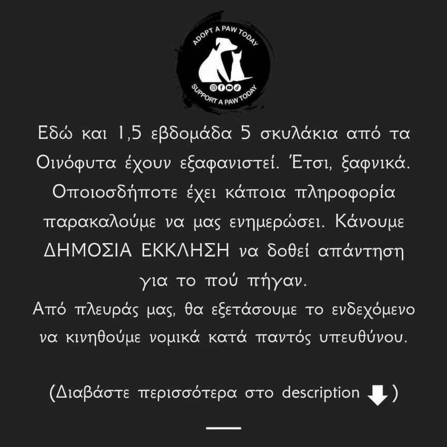 Σήμερα, είμαστε στη ΔΥΣΑΡΕΣΤΗ θέση να σας πούμε πως εδώ και 1,5 εβδομάδα πέντε σκυλάκια από εκεί έχουν εξαφανιστεί. Έχουν χαθεί από προσώπου γης. Έτσι, ξαφνικά.