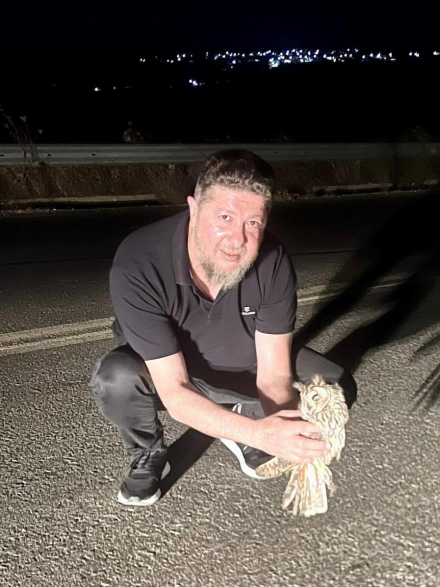 Δίχως χρονοτριβή, σταμάτησε με ασφάλεια το αυτοκίνητο στην άκρη του δρόμου και προσέγγισε το νυκτόβιο πτηνό, το οποίο δεν αντέδρασε καθόλου στις κινήσεις του άνδρα. Ο κ. Μακρογιαννάκης πήρε την κουκουβάγια στα χέρια του, τη μετέφερε στην άκρη του δρόμου και τής έδωσε να πιει νερό.