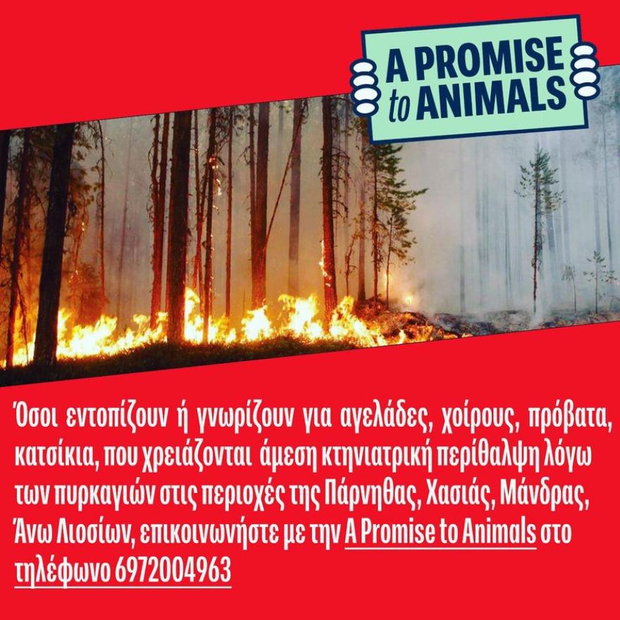 Όσοι εντοπίζουν ή γνωρίζουν για αγελάδες, χοίρους, πρόβατα, κατσίκια, που χρειάζονται άμεση κτηνιατρική περίθαλψη λόγω των πυρκαγιών στις περιοχές της Πάρνηθας, Χασιάς, Μάνδρας, Άνω Λιοσίων, επικοινωνήστε με την A Promise to Animals στο τηλέφωνο 697 2004963