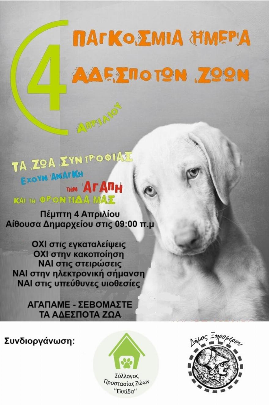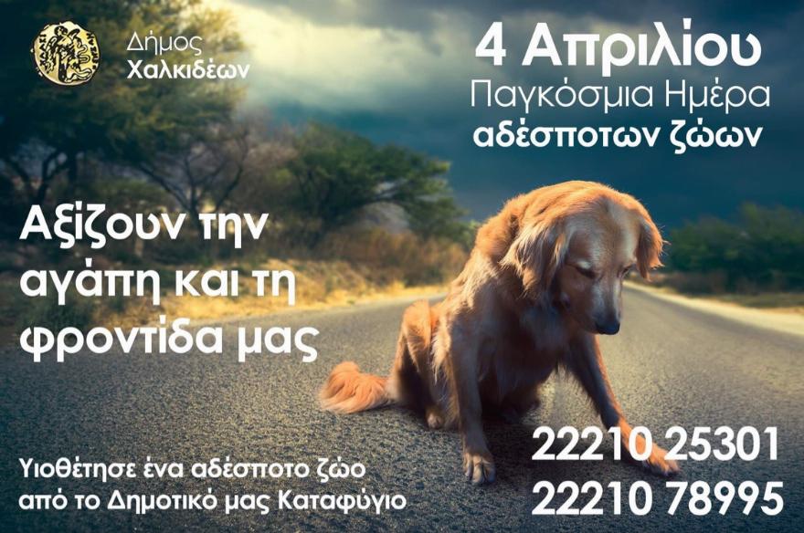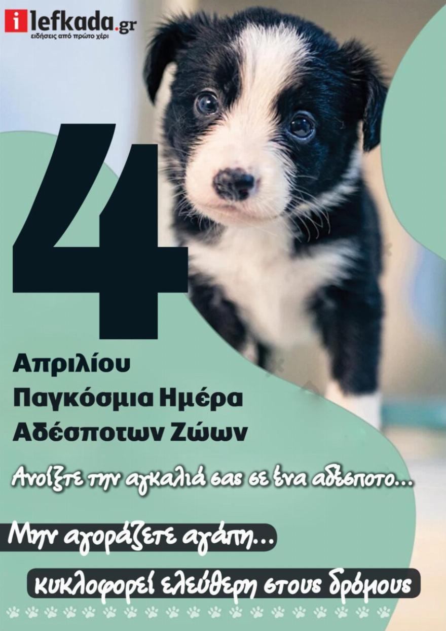 Η 4η Απριλίου αναδεικνύεται ως η Παγκόσμια Ημέρα Αδέσποτων Ζώων, μια πρωτοβουλία ξεκινημένη από φιλοζωικές οργανώσεις της Ολλανδίας με στόχο την ευαισθητοποίηση της διεθνούς κοινότητας σχετικά με την άθλια κατάσταση πολλών ζώων που αποτελούν αδέσποτα.