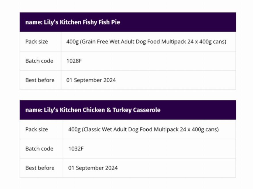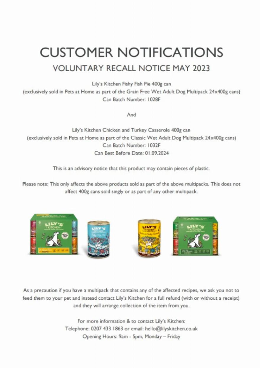 Η Lily’s Kitchen ανακαλεί μια παρτίδα Fishy Fish Pie και μια παρτίδα Chicken and Turkey Casserole επειδή μπορεί να περιέχουν κομμάτια πλαστικού. Ένας εκπρόσωπος της Υπηρεσίας Προτύπων Τροφίμων δήλωσε: «Η πιθανή παρουσία πλαστικού καθιστά τα προϊόντα μη ασφαλή για κατανάλωση για τα κατοικίδια ζώα σας και παρουσιάζει πιθανό κίνδυνο πνιγμού».