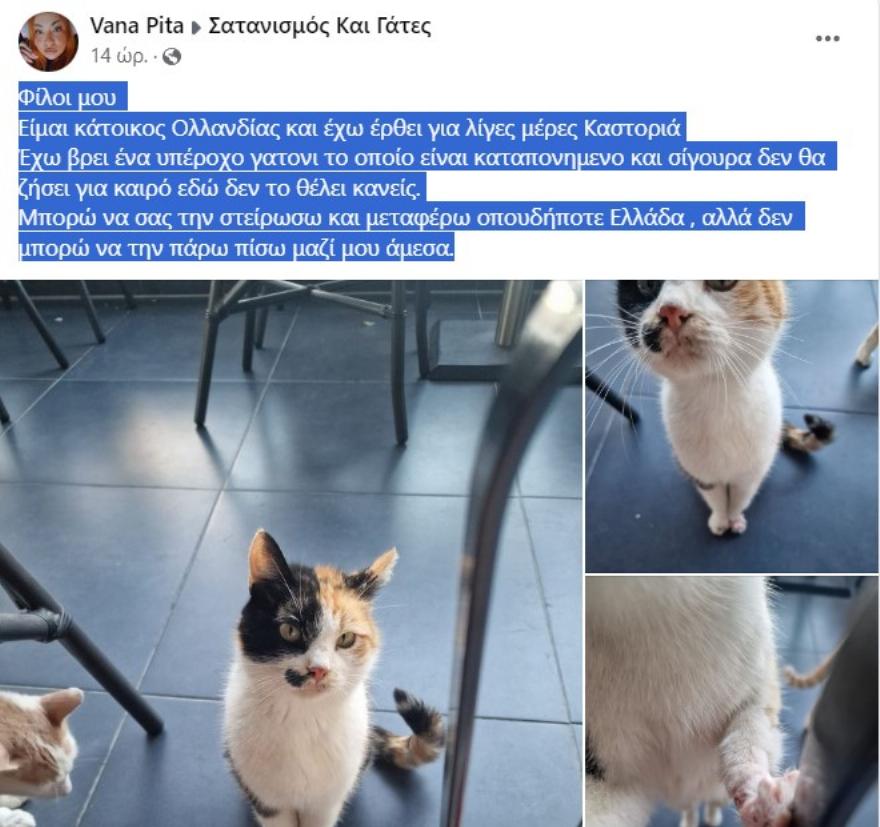 Η υιοθεσία ενός αδέσποτου ζώου είναι η πιο όμορφη πράξη που μπορούμε να κάνουμε. Χιλιάδες ζώα βρίσκονται εκεί έξω και ψάχνουν ένα παντοτινό σπίτι, αγάπη και φροντίδα. Τα ζώα και η συντροφιά τους δεν αγοράζονται. Πολλοί φιλόζωοι άνθρωποι ενδιαφέρονται και κοινοποιούν όμορφες φατσούλες που βρίσκουν και ψάχνουν παντοτινό σπίτι. Μια τέτοια ανάρτηση είδαμε πρόσφατα όπου μια φιλόζωη, κάτοικος εξωτερικού βρήκε μια πανέμορφη τρικολόρε γάτα άκρως φιλική και διατίθεται να την μεταφέρει οπουδήποτε στην Ελλάδα αρκεί να την υιοθετήσει ένας φιλόζωος γονιός.