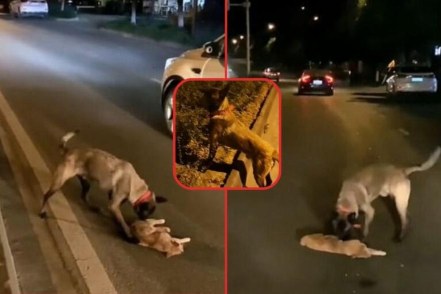Ο σκύλος εντόπισε την γάτα που είχε χτυπηθεί από διερχόμενο όχημα και είχε αφεθεί στη μέση του δρόμου, ενώ προσπάθησε απεγνωσμένα να την φέρει στη ζωή. Αρχικά, ο σκύλος χρησιμοποίησε το στόμα και το ένα πόδι του για να προσπαθήσει να ξυπνήσει τη γάτα, ώστε να φύγει από τον πολυσύχναστο δρόμο και να αποφύγει να την πατήσει ξανά κάποιο αυτοκίνητο. Αφού απέτυχε, ήταν τόσο απελπισμένος που χρησιμοποίησε και τα δύο μπροστινά του πόδια για να προσπαθήσει να μεταφέρει τη γάτα. Ενώ τελικά, επέλεξε να χρησιμοποιήσει το στόμα του για να τη σύρει απαλά και τη μετέφερε στην άκρη του δρόμο.