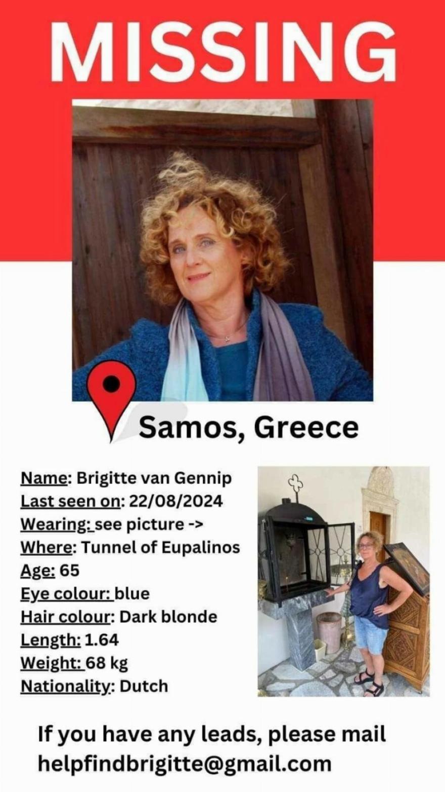 Η Speedy είναι ο σκύλος διάσωσης που συνδράμει στην αναζήτηση της Brigitte Van Gennip. Σήμερα αναμένονται στη Σάμο οχτώ σκύλοι συνοδευόμενοι από δώδεκα συνοδούς από το Ντίσελντορφ. Η άφιξή τους έχει σκοπό να ενισχύσει τις προσπάθειες για τον εντοπισμό της 64χρονης τουρίστριας από την Ολλανδία, Brigitte Van Gennip (Μπριζίτ Βαν Γκένιπ), η οποία αγνοείται από την Πέμπτη 22 Αυγούστου.