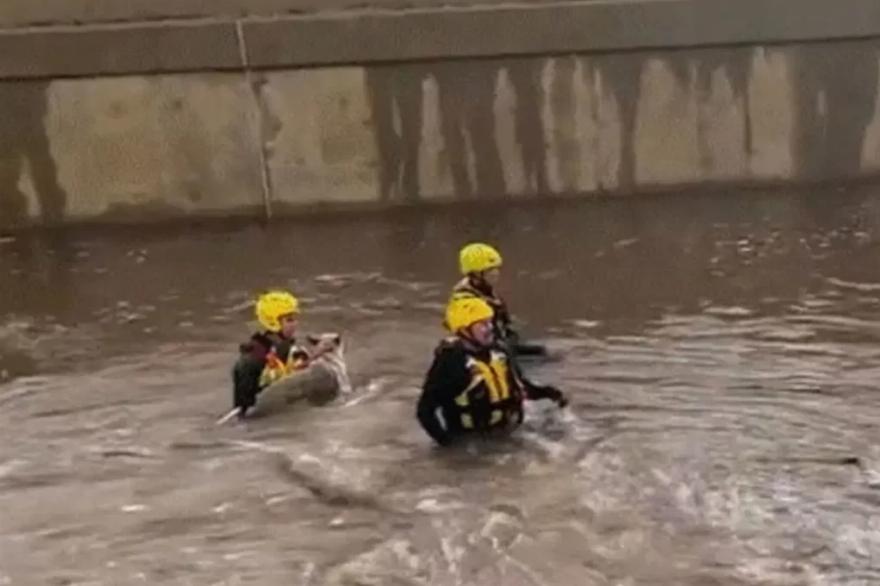 Βίντεο από τους πυροσβέστες έδειξε τους διασώστες να χρησιμοποιούν μακριές κολώνες για να αγκυροβολήσουν. Δύο προσπάθησαν να μπλοκάρουν το γρήγορο ρεύμα για τον τρίτο, κρατώντας τον σκύλο.