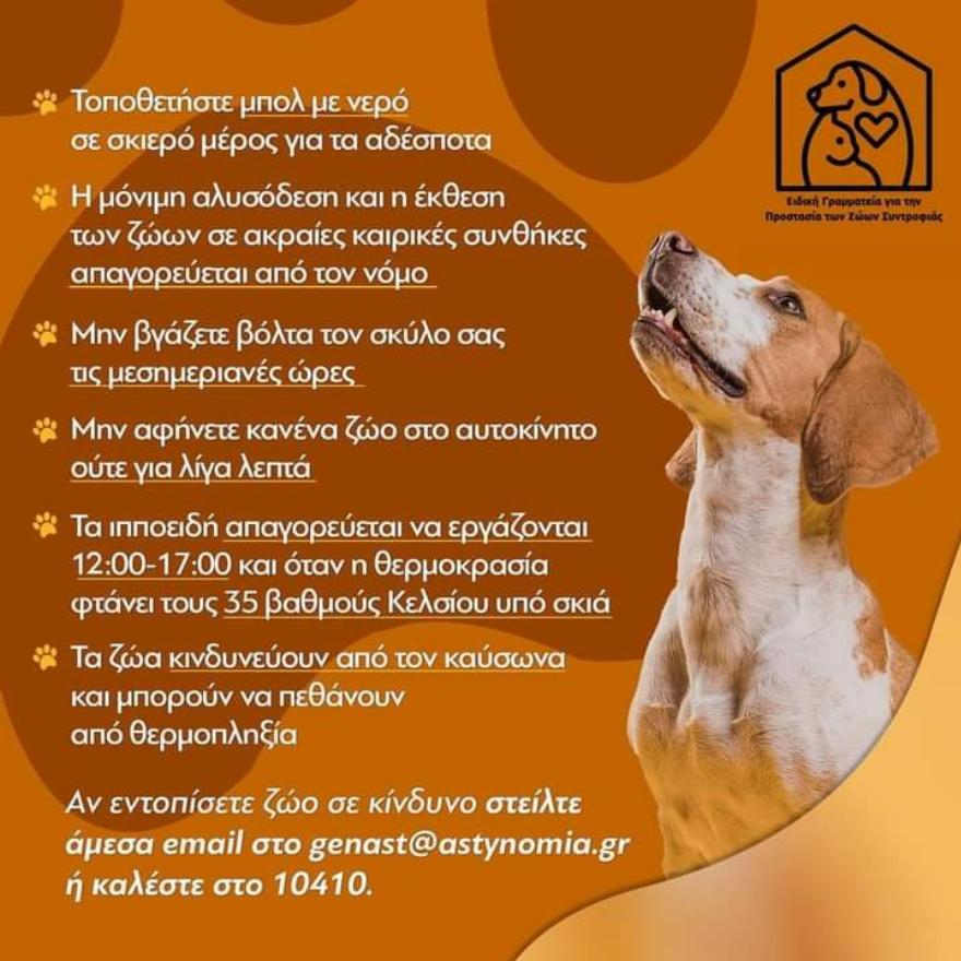Δεν ξεχνάμε τους «τετράποδους φίλους μας», που επίσης υποφέρουν από τις υψηλές θερμοκρασίες και αντιμετωπίζουν τους ίδιους κινδύνους με εμάς! Τηρούμε τις οδηγίες σε ό,τι αφορά στην προστασία τους!