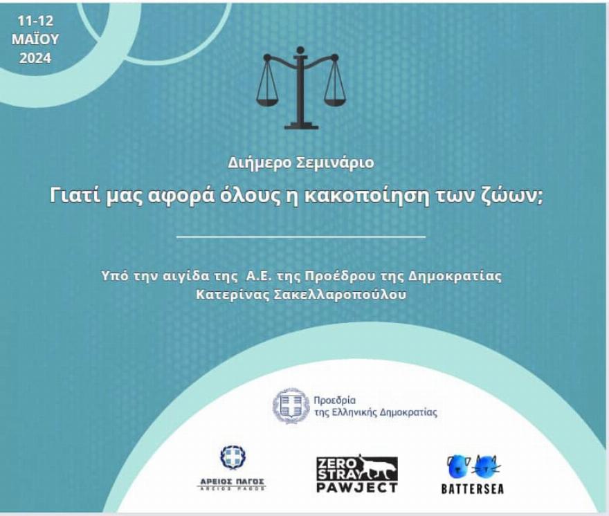 Σεμινάριο διάρκειας δύο ημερών για την κακοποίηση των ζώων, υπό την αιγίδα της Α.Ε. της Προέδρου της Δημοκρατίας, κυρίας Κατερίνας Σακελλαροπούλου, διοργανώνεται από την Zero Stray Pawject. Το σεμινάριο συνδράμει ο Αρειος Πάγος, η Εισαγγελία του Αρείου Πάγου, και η Ειδική Γραμματεία για την Προστασία των Ζώων Συντροφιάς, με τίτλο “Γιατί μας αφορά όλους η κακοποίηση των ζώων;”.