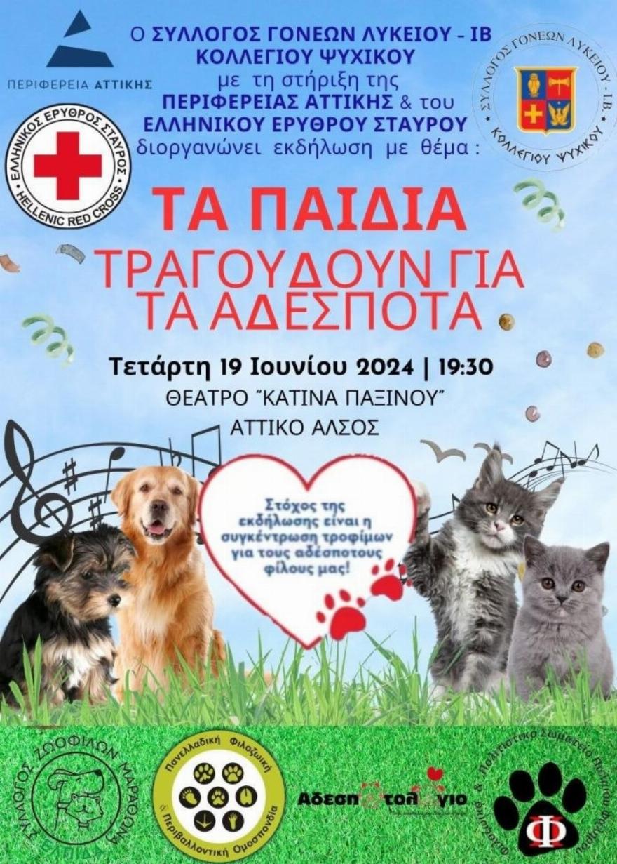 Την Τετάρτη 19 Ιουνίου 2024, στο θέατρο «Κατίνα Παξινού» στο Αττικό Άλσος, θα πραγματοποιηθεί μια ιδιαίτερη εκδήλωση-συναυλία με τίτλο «Τα παιδιά τραγουδούν για τα αδέσποτα».