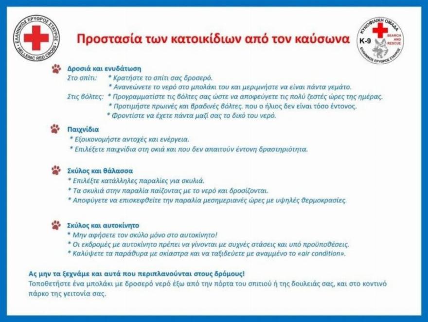 Ειδική αναφορά κάνει ο Ερυθρός Σταυρός και για τα αδέσποτα, που καλεί τους πολίτες να τοποθετήσουν ένα μπολάκι νερό έξω από την πόρτα του σπιτιού ή της δουλειάς τους, και στο κοντινό πάρκο της γειτονιάς τους.