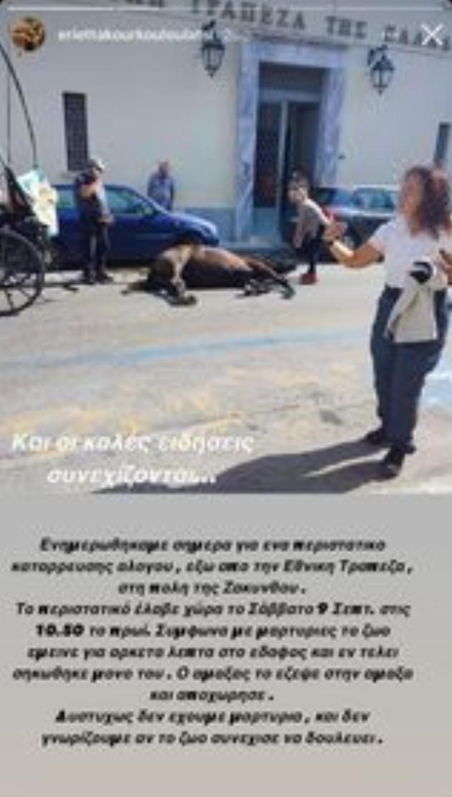 Συγκεκριμένα, η κόρη της Μαριάννας Λάτση με ευαισθησίες σε ό,τι αφορά τα ζώα έγραψε: «Ενημερωθήκαμε σήμερα για ένα περιστατικό κατάρρευσης αλόγου, έξω από την Εθνική Τράπεζα, στην πόλη της Ζακύνθου. Το περιστατικό έλαβε χώρα το Σάββατο 9 Σεπτεμβρίου στις 10.50 το πρωί. Σύμφωνα με μαρτυρίες το ζώο έμεινε για αρκετά λεπτά στο έδαφος και εν τέλει σηκώθηκε μόνο του. Ο αμαξάς το έζεψε στην άμαξα κι αποχώρησε. Δυστυχώς δεν έχουμε μαρτυρία, και δεν γνωρίζουμε αν το ζώο συνέχισε να δουλεύει».