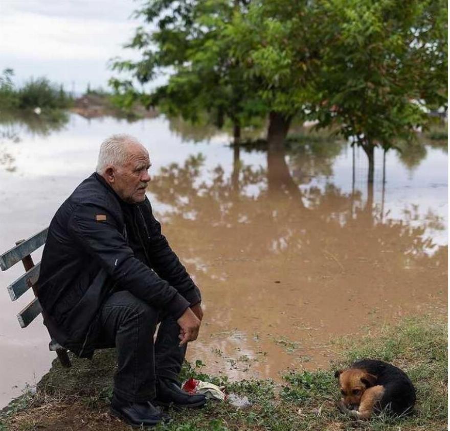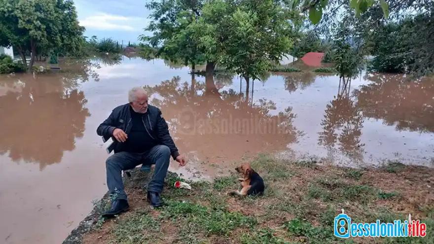 Στην φωτογραφία του Αχιλλέα Χηρα, ένας ηλικιωμένος άνδρας στην Πηνειάδα κάθεται αποκαρδιωμένος με το σκυλάκι του ενώ γύρω το τοπίο είναι πλημμυρισμένο.