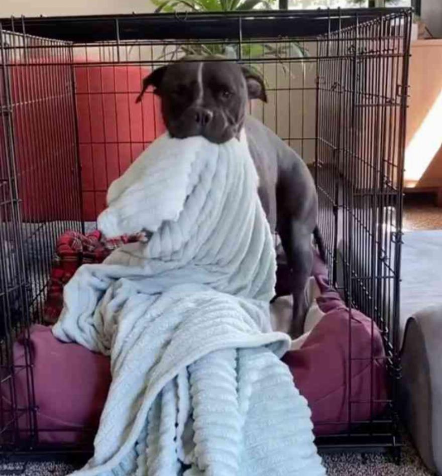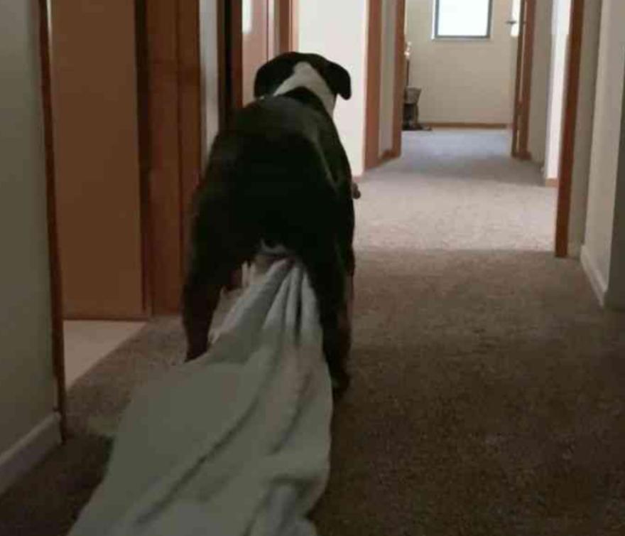 Αυτός ο σκύλος, αν και ευτυχώς τώρα έχει την καλύτερη ζωή που θα μπορούσε να έχει με την οικογένειά του, έχει ακόμα αυτές τις τραυματικές πληγές. Γι ‘αυτό τον ονόμασαν Blankie, γιατί περπατάει πάντα στο σπίτι με τη κουβέρτα στο στόμα του.