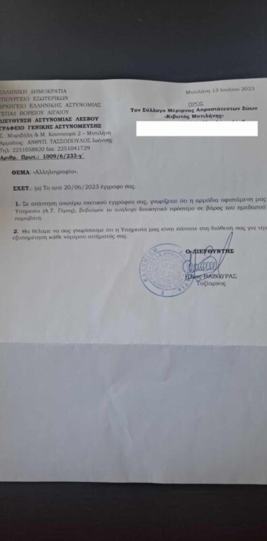 «Ευχαριστούμε θερμά την Αστυνομική Διεύθυνση Λέσβου για την άμεση ανταπόκριση.