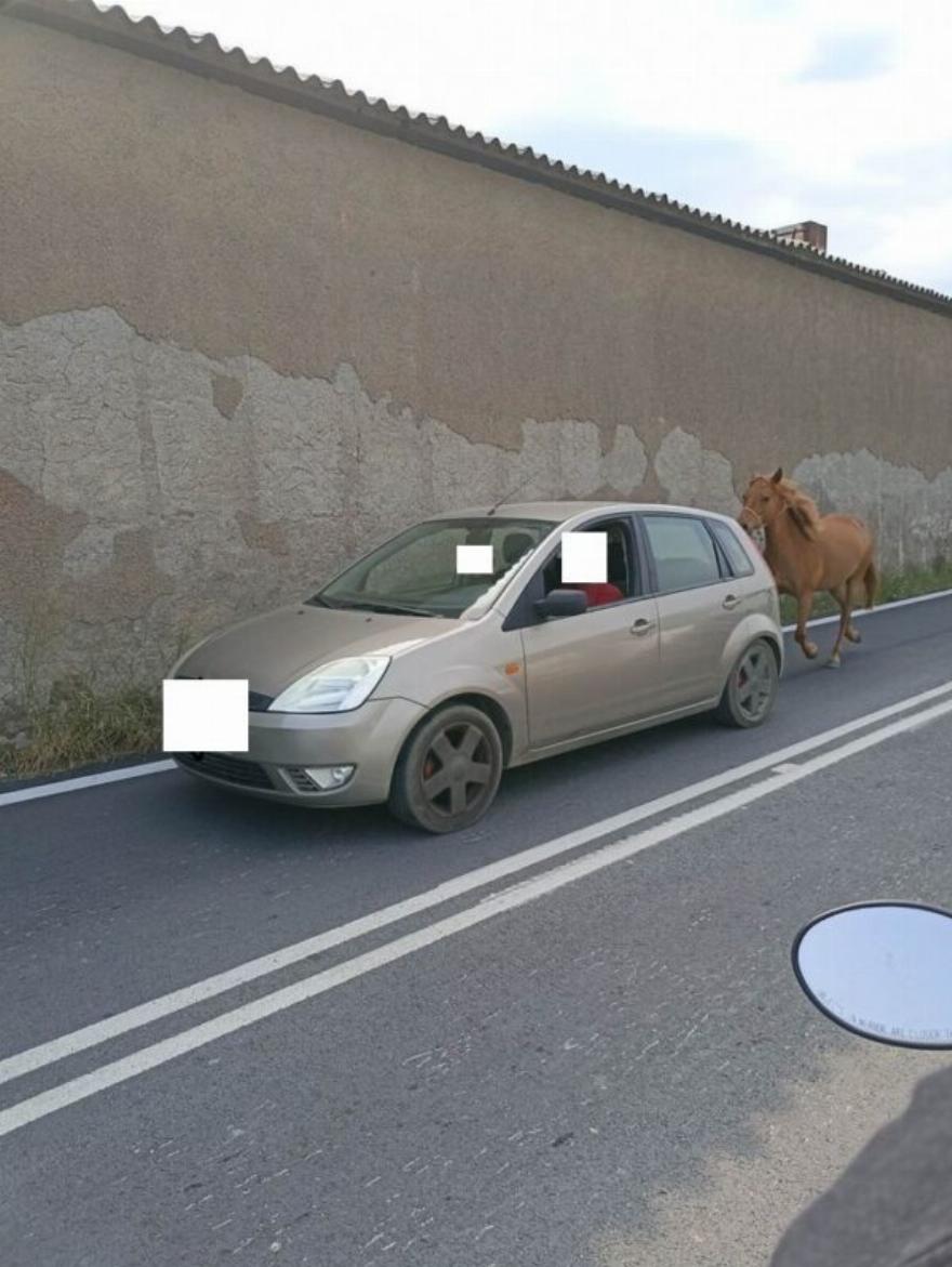 Η φωτογραφία τραβήχτηκε στην περιοχή Πέραμα της Λέσβου, όπου οι κηδεμόνες των αλόγων τα πέρασαν για άμαξες, τα έδεσαν στο πίσω μέρος του δικού τους αυτοκινήτου και τα οδήγησαν στο δρόμο! Σύμφωνα με τους εθελοντές, η πρακτική αυτή είναι επικίνδυνη τόσο για τα ίδια τα άλογα όσο και για τους άλλους οδηγούς. Επίσης, είναι παράνομη και αποτελεί παράβαση του άρθρου 3 του Ευρωπαϊκού Κανονισμού 1/2005 και του άρθρου 17 της ΚΥΑ 314754/2009 (ΦΕΚ 2025/Β/18-9-2009) και τιμωρείται με πρόστιμο από 500 έως 3.000 ευρώ.