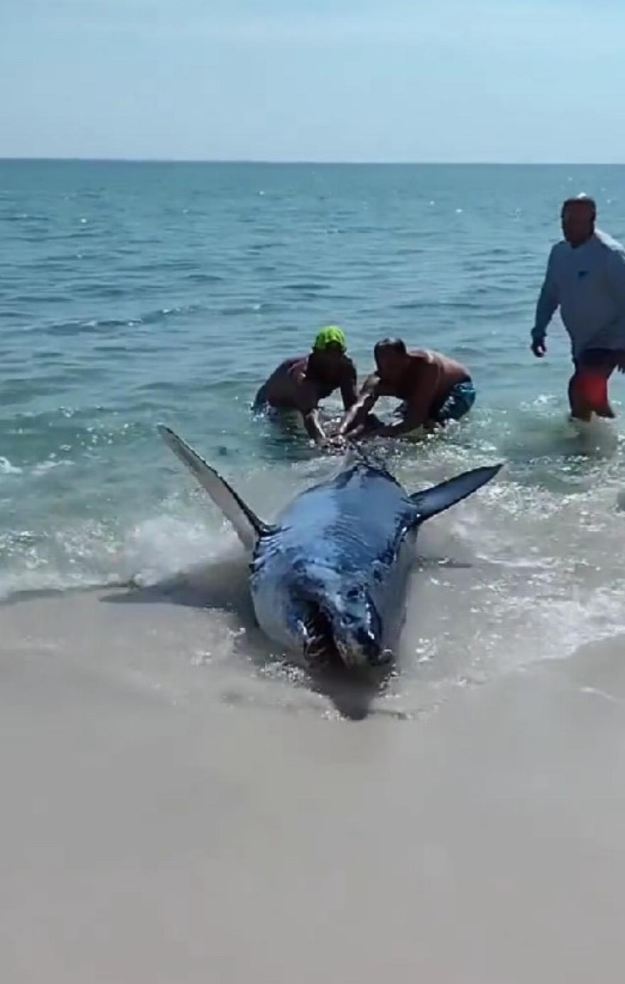 Οι λουόμενοι είδαν τον καρχαρία να στριφογυρίζει, μη μπορώντας να αναπνεύσει έξω από το φυσικό του περιβάλλον, και τέσσερις ντόπιοι ξεκίνησαν να βοηθούν τον καρχαρία, ο οποίος τελικά τραβήχτηκε πίσω στη θάλασσα από το ουραίο πτερύγιο του.