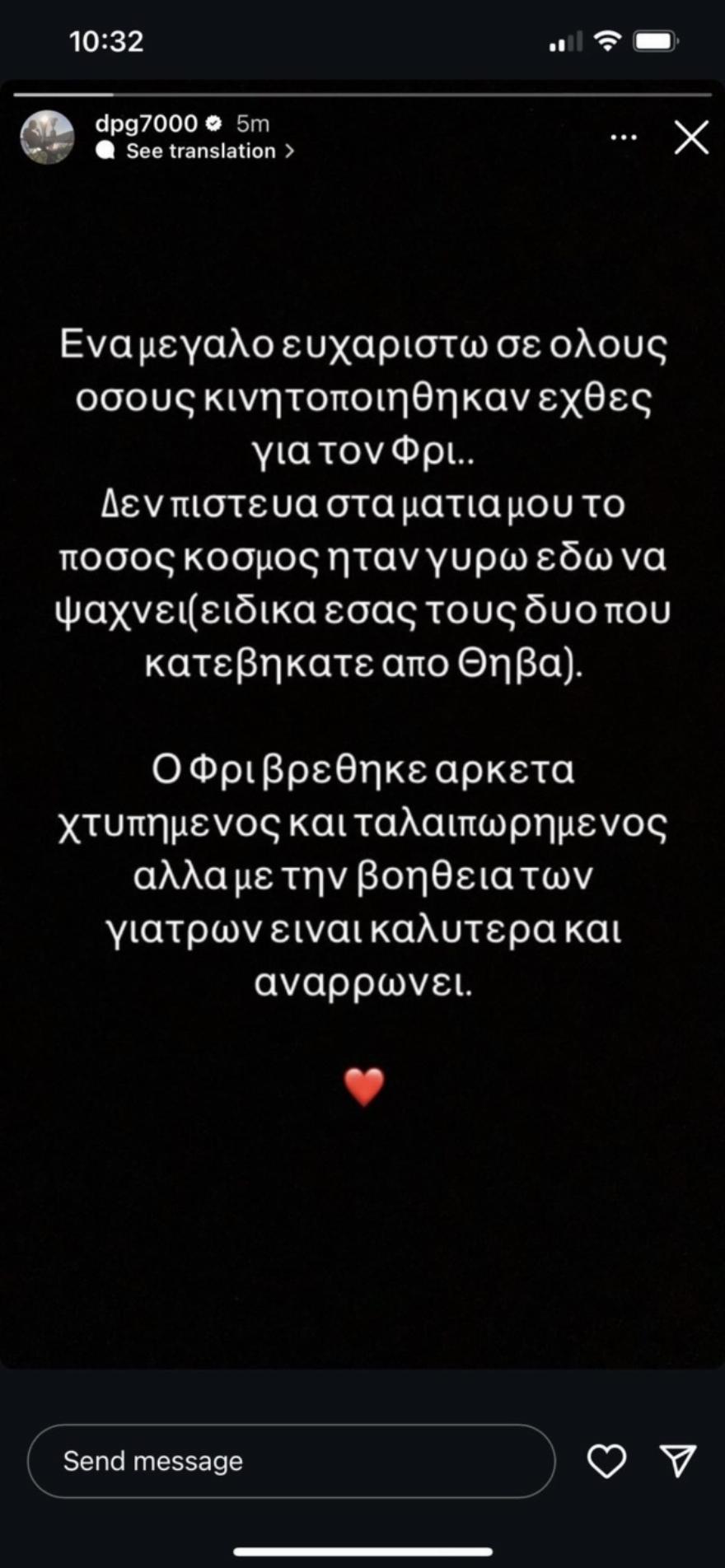 Το ίδιο πρωί, ο Δημήτρης Γιαννακόπουλος ανάρτησε στο Instagram ζητώντας τη βοήθεια του κοινού για τον εντοπισμό του Free. Οι φίλοι και ακόλουθοί του αντέδρασαν άμεσα, ξεκινώντας έρευνες στην περιοχή για να βρουν τον γάτο.
