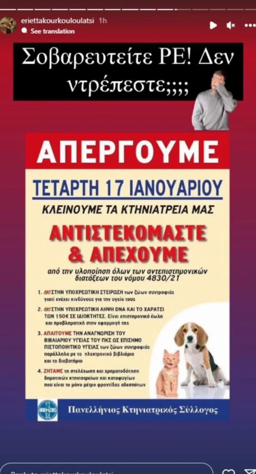H ιδρύτρια του Save a Greek Stray αντέδρασε δημόσια για την απεργία των κτηνίατρων οι οποίοι απεργούν σήμερα Τετάρτη 17 Ιανουαρίου, καθώς είναι αντίθετοι για το Εθνικό Ψηφιακό Μητρώο Ζώων Συντροφιάς, τις υποχρεωτικές στειρώσεις και την υποχρεωτική λήψη dna.
