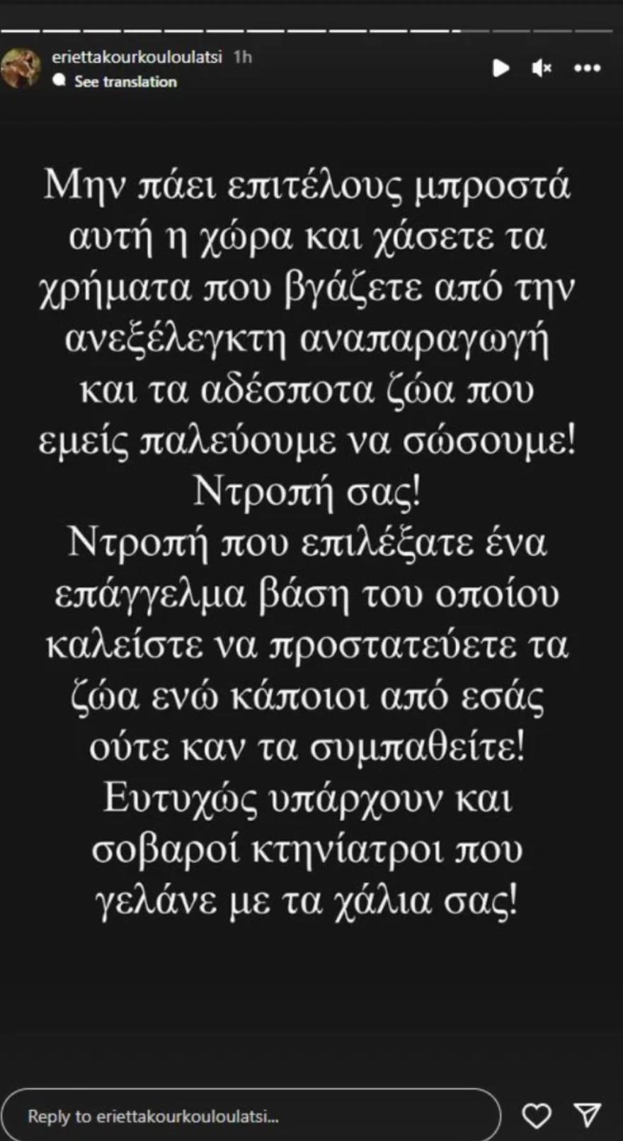 «Μην πάει επιτέλους μπροστά αυτή η χώρα και χάσετε τα χρήματα που βγάζετε από την ανεξέλεγκτη αναπαραγωγή και τα αδέσποτα ζώα που εμείς παλεύουμε να σώσουμε! Ντροπή σας! Ντροπή που επιλέξατε ένα επάγγελμα βάση του οποίου καλείστε να προστατεύετε τα ζώα ενώ κάποιοι από εσάς ούτε καν τα συμπαθείτε! Ευτυχώς υπάρχουν και σοβαροί κτηνίατροι που γελάνε με τα χάλια σας!» συνέχισε.