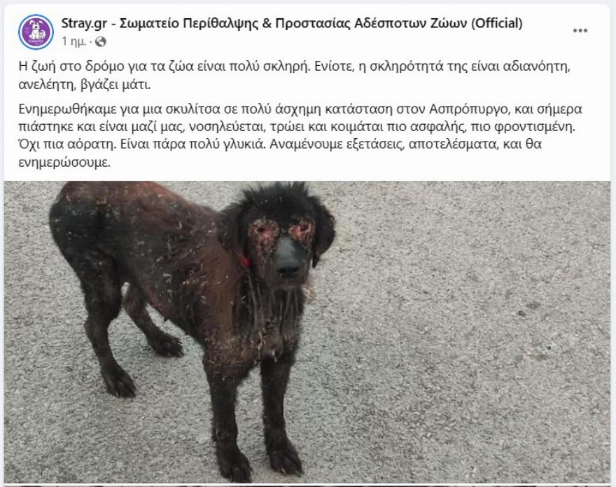 Καλά είναι τα νέα για τη σκυλίτσα που εντοπίστηκε τις προηγούμενες μέρες να τριγυρνάει στον Ασπρόπυργο, στην περιοχή του Κουταλά, σε άθλια κατάσταση.