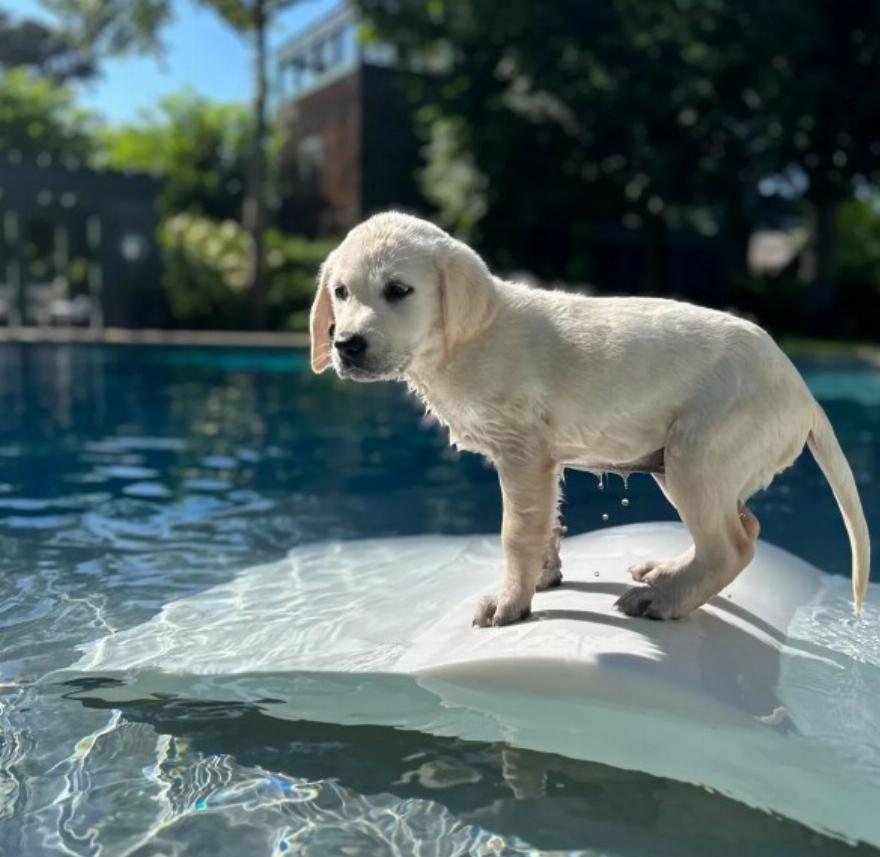 Η ανάρτηση περιλαμβάνει φωτογραφίες με το νέο κατοικίδιο να απολαμβάνει την ύπαιθρο, μια πισίνα και να περνάει χρόνο στον κήπο.