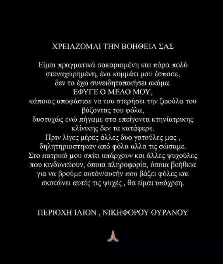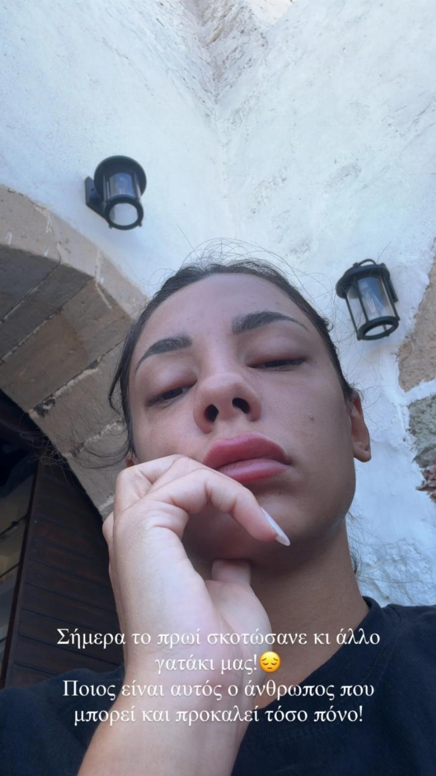 «Σήμερα το πρωί σκοτώσανε κι άλλο γατάκι μας. Ποιος είναι αυτός ο άνθρωπος που μπορεί και προκαλεί τόσο πόνο», ανέφερε στο Instagram story της.