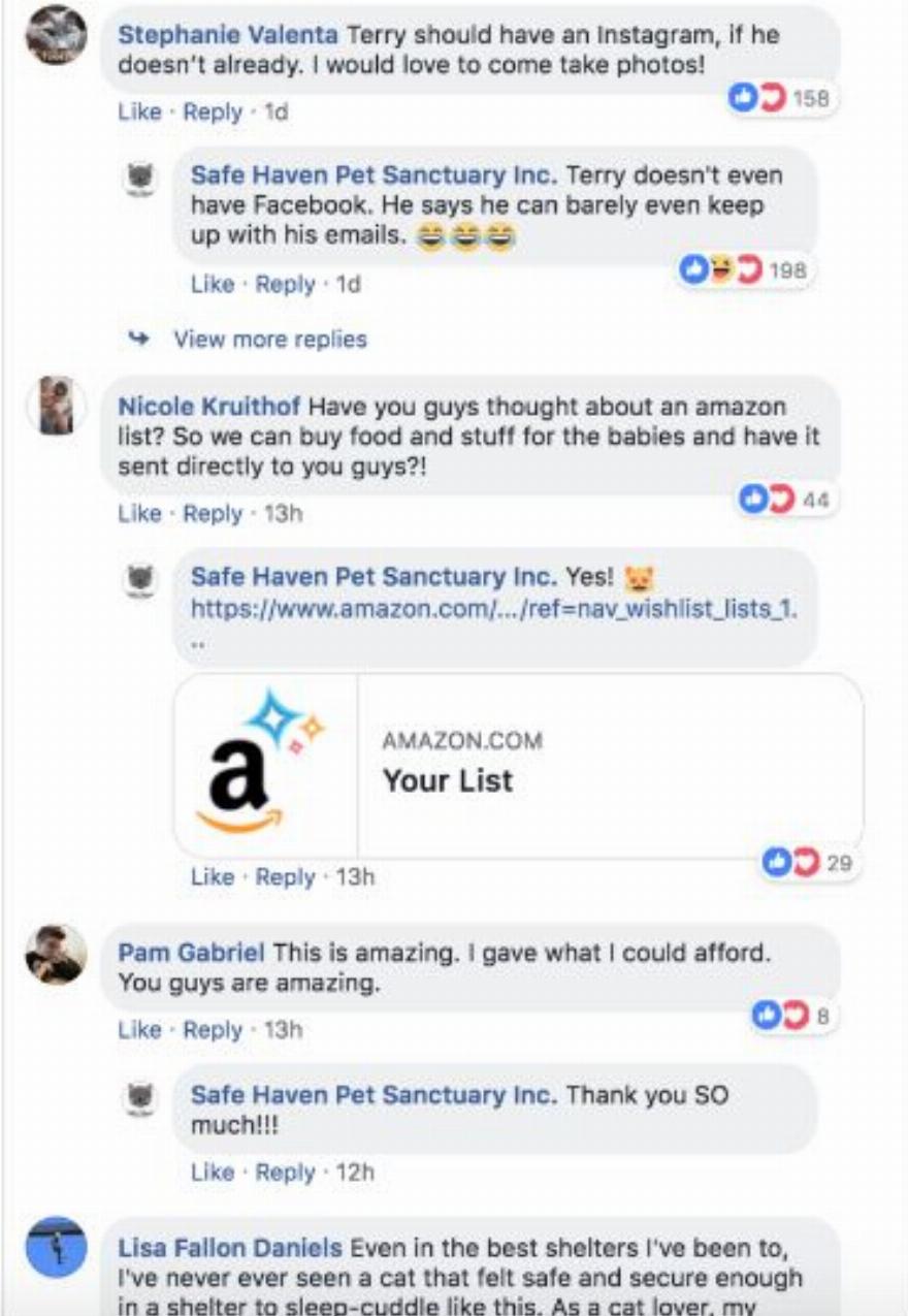 Κάθε μέρα τις φροντίζει, παίρνει μερικούς υπνάκους και αγκαλιές μαζί τους, και τώρα που είναι διάσημος ως ο “παππούς γάτα”, δημιουργεί κύματα επιρροής στο διαδίκτυο, εμπνέοντας πολλούς να υποστηρίξουν το καταφύγιο. Αν ενδιαφέρεστε να δείξετε λίγη υποστήριξη, μπορείτε να το κάνετε ακολουθώντας το Safe Haven Sanctuary στο Facebook και κάνοντας μια δωρεά στην ιστοσελίδα του.