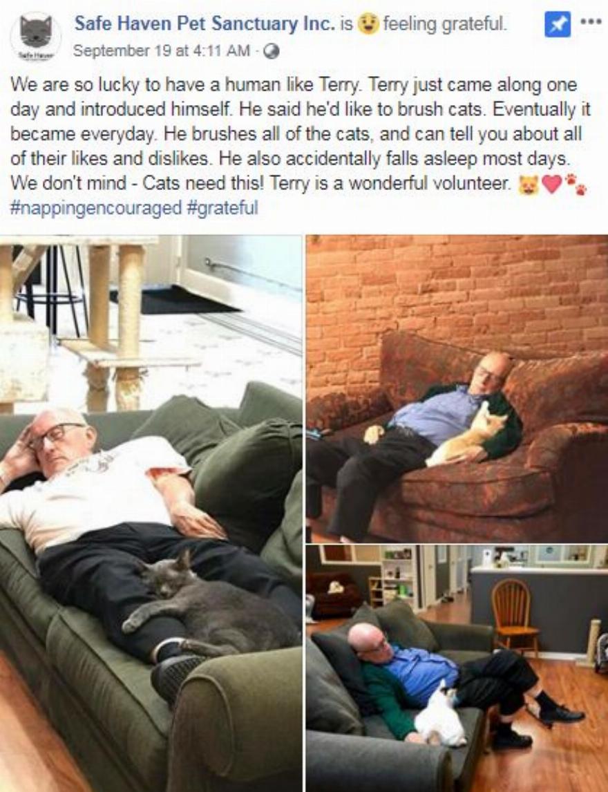 Ο Terry είναι ένας άνθρωπος που αγαπάει τα ζώα και όταν έμαθε για το καταφύγιο γατών χωρίς κλουβιά και χωρίς θανάτους, ένιωσε την ανάγκη να προσφέρει βοήθεια. Με τη γοητεία του Terry και τις εξαιρετικές ικανότητές του στο βούρτσισμα των γατών, δεν χρειάστηκε πολύς χρόνος για να κερδίσει την καρδιά κάθε γάτας διάσωσης. Μια εφάπαξ επίσκεψη μετατράπηκε εύκολα σε δέσμευση ως επίσημος εθελοντής.