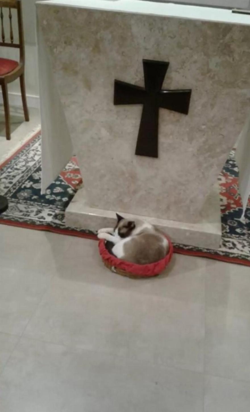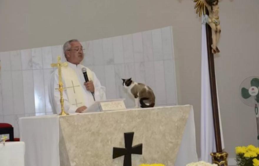 Αυτός είναι ο Τζούνιορ – ένας όμορφος αδέσποτος γάτος που εμφανίστηκε σε αυτή την ενορία στη Βραζιλία μια μέρα πριν από μερικούς μήνες και αποφάσισε να μην φύγει ποτέ.