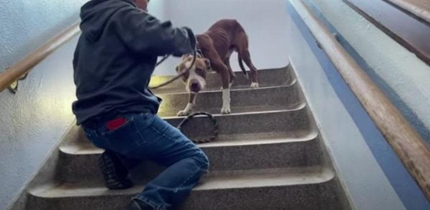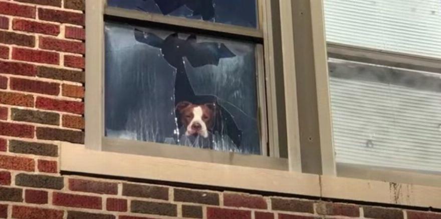 Η Donna, η Natalie και ο Scott από το Stray Rescue έσπευσαν εκεί και εντόπισαν το καφέ Pit Bull να τους κοιτάζει από ένα σπασμένο παράθυρο στον τελευταίο όροφο του σχολείου.