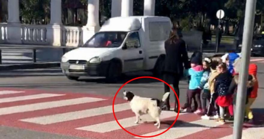Ο τετράποδος «τροχονόμος» αντιλαμβάνεται ότι μια τάξη νηπιαγωγείου θέλει να διασχίσει τον δρόμο και τρέχει μπροστά τους για να σταματήσει, γαβγίζοντας, τα διερχόμενα αυτοκίνητα.