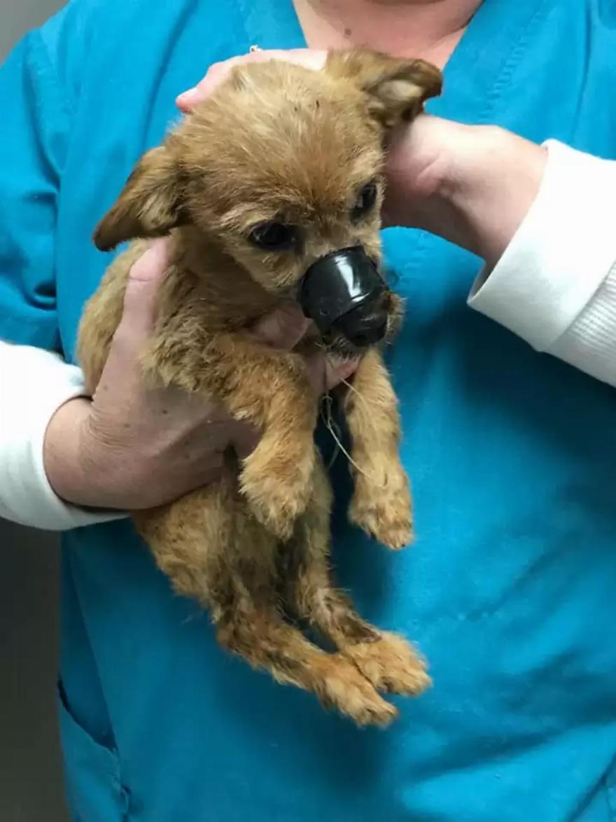 Το κτηνιατρικό προσωπικό άρχισε αμέσως να ασχολείται με το κουτάβι. Ήταν αδυνατισμένο και το δέρμα του είχε υποστεί σοβαρές ζημιές κάτω από την ταινία. Εκτιμούν ότι η ταινία πρέπει να ήταν γύρω από το ρύγχος του για μέρες.
