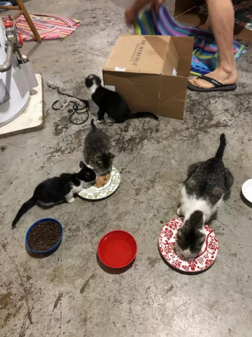 “Την πιο ζεστή και υγρή ίσως μέρα του καλοκαιριού, πήγα εκεί και έπιασα τα τρία γατάκια της, τα οποία ήταν πολύ εξοργισμένα που τα έπιασαν και ήταν πιθανότατα 8 εβδομάδων εκείνη τη στιγμή”, είπε η Redmon. “Η Αθηνά μας ακολούθησε μέσα ευτυχισμένη και βάλαμε λίγο φαγητό για όλους. Τα γατάκια ήταν πολύ νευρικά, αλλά η Αθηνά ήταν ο κανονικός αγαπησιάρικος και χαρούμενος εαυτός της”.