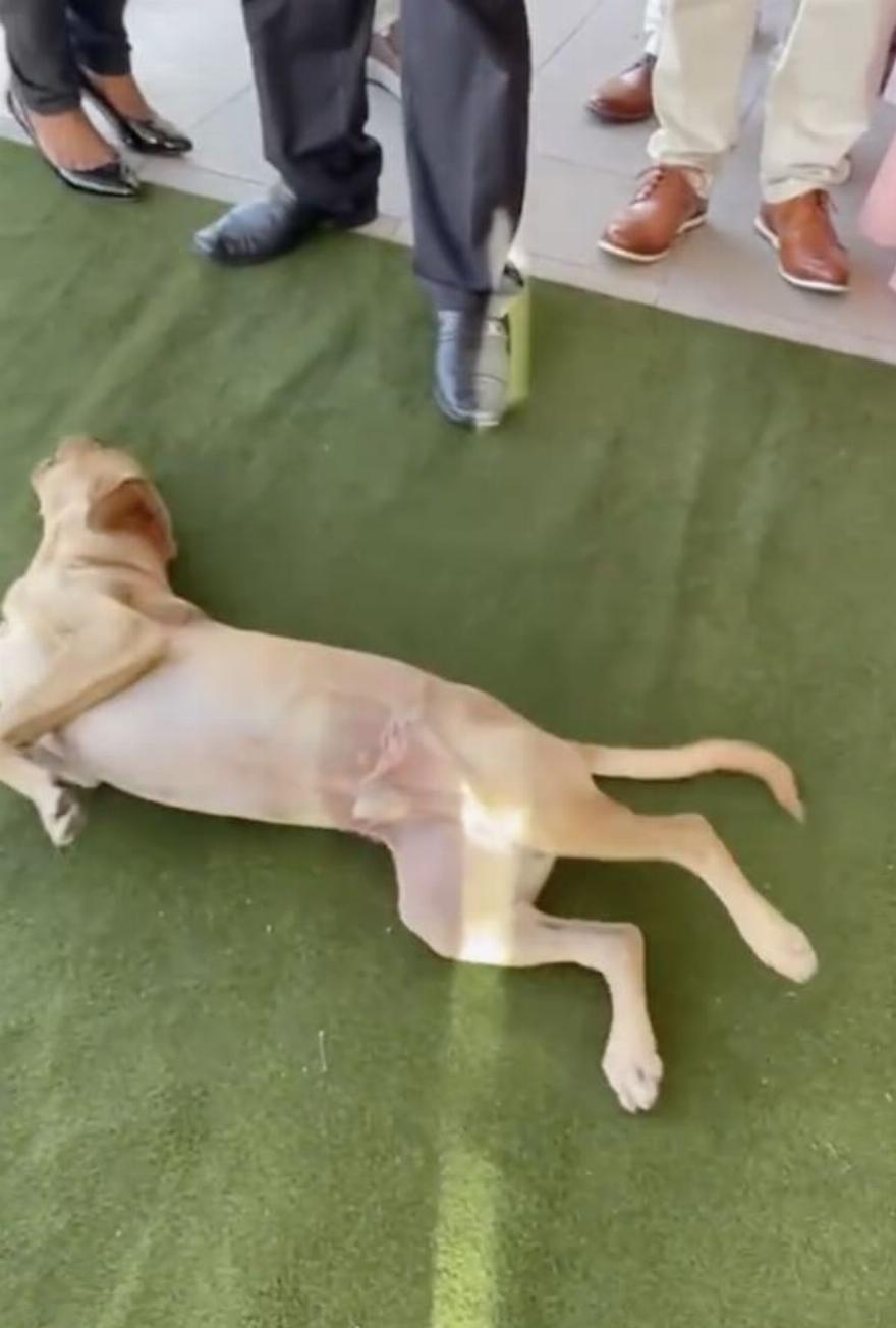 Οι καλεσμένοι του γάμου διασκέδασαν αμέσως όταν ο σκύλος – που τώρα ονομάζεται Braiá Caramelo de Jesus – εμφανίστηκε στα σκαλιά της εκκλησίας Rosário. Ανακατεύτηκε αξιολάτρευτα ανάμεσά τους, κυλιόμενος στην κοιλιά του.
