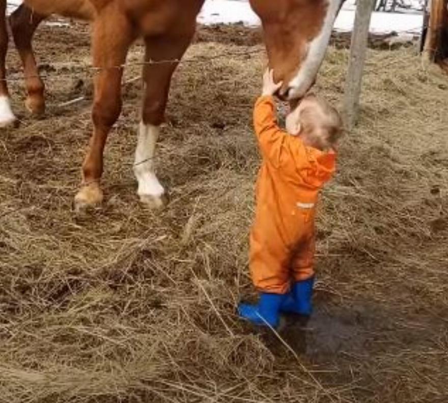 Με το πορτοκαλί παλτό του και τις μπλε μπότες του, ο μικρός φτάνει ψηλά και φιλάει το ευγενικό άλογο στα χείλη. Το άλογο, με τη σειρά του, φιλάει το κεφάλι του αγοριού τόσο γλυκά. Είναι σχεδόν σαν καρτούν!
