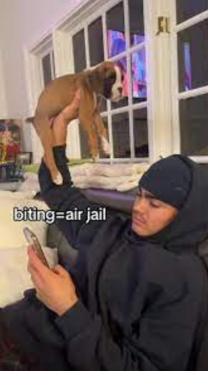 Στο viral κλιπ, που μοιράστηκε στο TikTok τη Δευτέρα με το όνομα χρήστη Uservxjduxxhhs, ο άνδρας φαίνεται να κρατάει το κουτάβι του, ένα νεαρό μπόξερ, στο ένα χέρι, κρατώντας το αιωρούμενο στον αέρα, αφού εκείνο συμπεριφέρθηκε άσχημα και προσπάθησε να τον δαγκώσει.